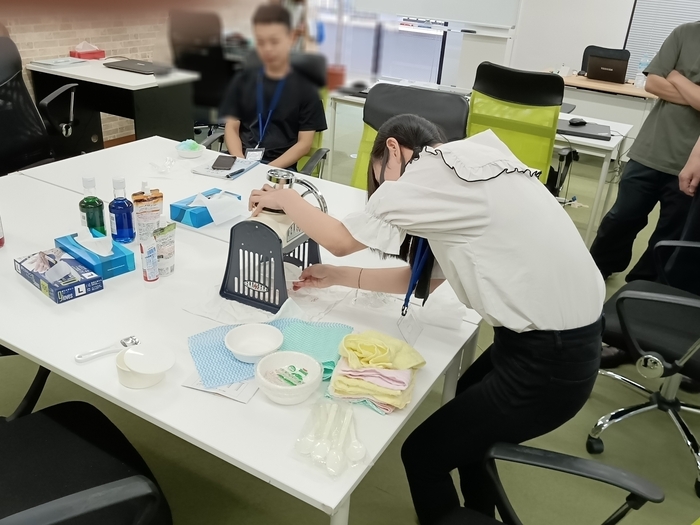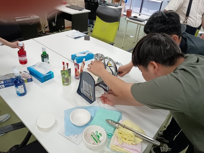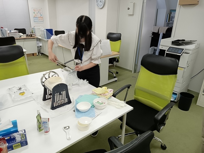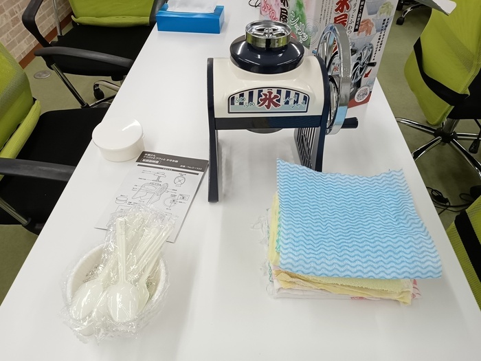 当日は近くのスーパーにかき氷シロップを一緒に買い出しに行ってもらったり、去年、洗った後、分解されてそのままだったかき氷器を、利用者さんに組み立てていただきました。