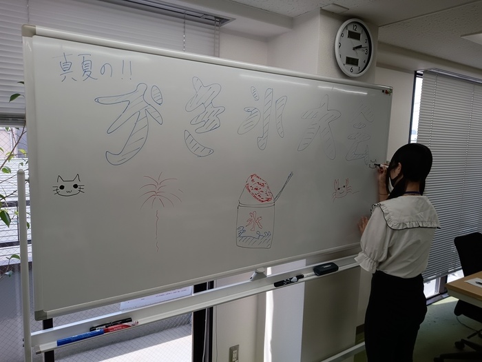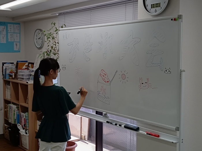 一通り食べ終わって、みなさん、ホワイトボードに書いた題字にデコレーションしたり、絵を自由に描いてくれています。
